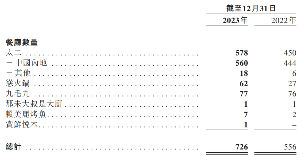 而且在一众头部连锁品牌求稳的当下,九毛九的门店仍在持续扩张。九毛九集团去年净增170家餐厅,其中太二128家、怂火锅35家、九毛九1家。