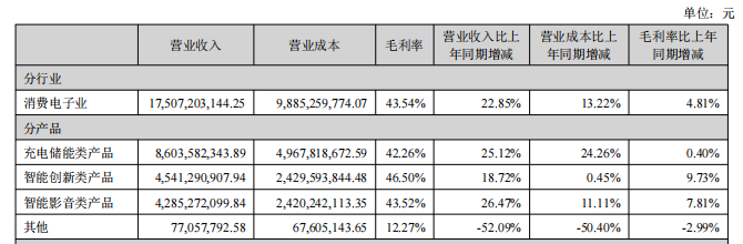 据安克创新2023年财报显示,充电储能类产品、智能创新类、智能影音类产品在营收中占比分别为49.14%,25.94%、24.85%。换言之,充电储能类产品为安克营收支柱。