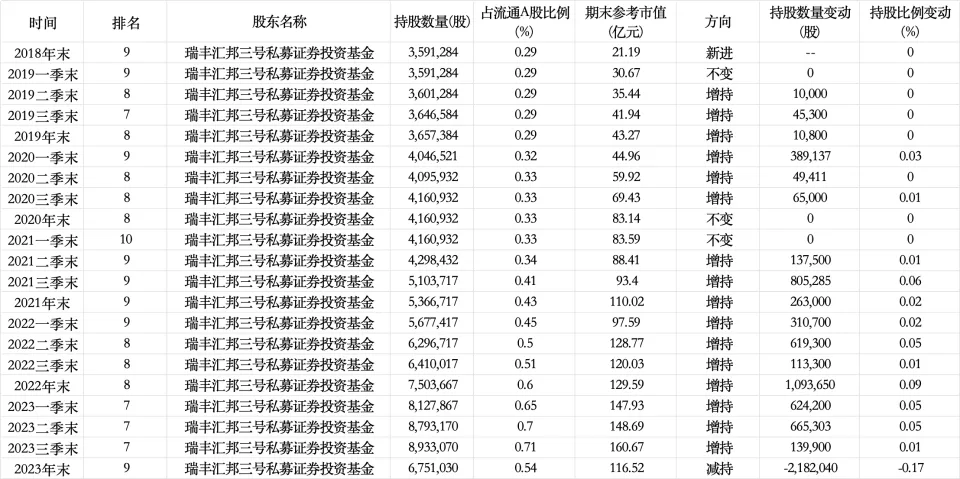 2018年四季度,瑞丰汇邦首次出现在贵州茅台的前十大流通股东之列,持股359.13万股,参考市值约21.19亿元。时代周报记者梳理发现,在持股贵州茅台期间,瑞丰汇邦曾16次增持。持仓市值巅峰出现在2023年三季度末,当时,瑞丰汇邦持股893.31万股,参考市值约160.67亿元。