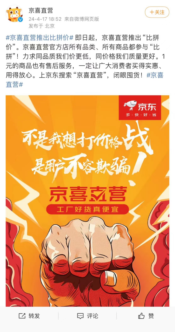 同月,京东旗下的特价购物品牌京喜直营发布微博,官宣发起“比拼价”活动。