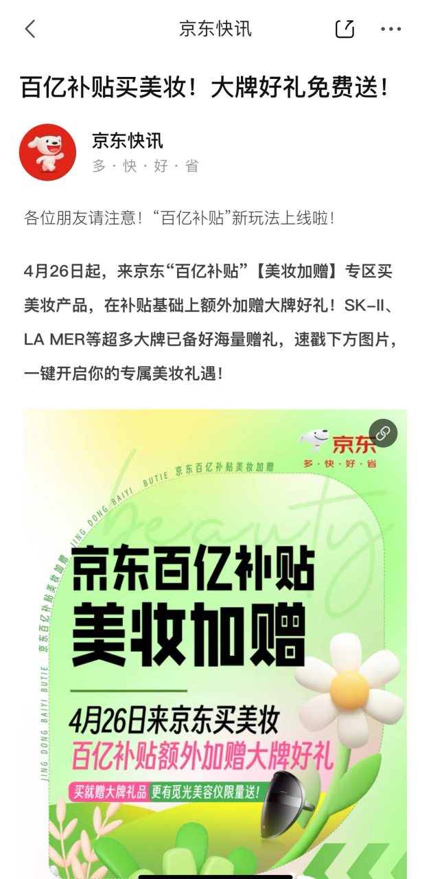 近日,京东发布站内公告称,4月26日起,来京东“百亿补贴”「美妆加赠」专区买美妆产品,在补贴基础上额外加赠大牌好礼!