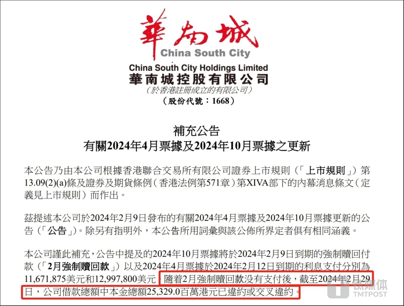 2024年年初时,华南城曾对外表示,预期不会在2024年2月12日到期支付“2024年4月票据”的一笔利息,若3月13日前未付息,该笔票据将违约;同时预期不会在2月9日到期的“2024年10月票据”强制赎回款项付款,也将导致这笔票据违约。