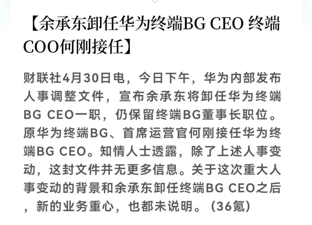 一个猜测,余承东卸职将接下更重的担子。昨晚今晨最重磅的行业消息,莫过于余承东的职位变动。根据36氪透露,4月30日下午,华为内部发布人事调整文件,宣布余承东将卸任华为终端BG CEO一职,仍保留终端BG董事长职位。原华为终端BG、首席运营官何刚接任华为终端BG CEO。