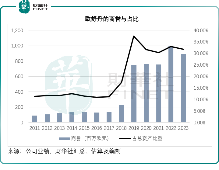 不过需要注意的是,欧舒丹今年通过收购新品牌已累积了不低的商誉,见下图,在2019年和2021年分别收购Elemis与Sol de Janeiro之后,欧舒丹的商誉狂飙,占总资产的比重由2011财年上市后的11.37%,跃升至2023财年的31.73%。
