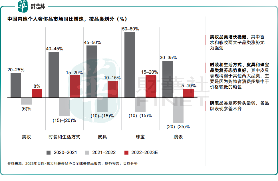 但需要注意的是,中国内地的奢侈品消费或从2022年的低位回升,根据贝恩公司的估算,2023年中国内地美妆市场或恢复单位数增长,见下图。