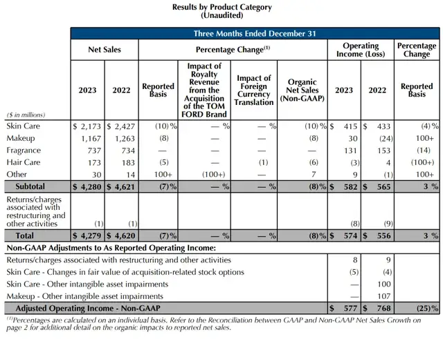 这两年,雅诗兰黛的日子不好过,据其最新公布的2023年9月30日至2023年12月31日的2024财年第二季度财报,集团营收42.79亿美元,同比下滑7.38%。净利润3.24亿美元,同比减少18.39%。特别是护肤品类别的销售额从2022年的24.27亿美元下降至2023年的21.73亿美元,下降了10%,化妆品的销售额也下降了8%。
