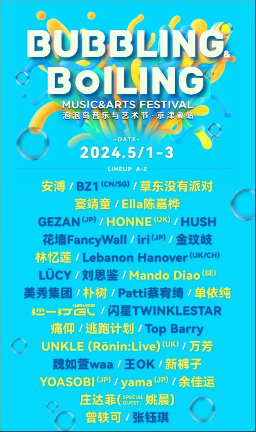 在去年邀请法国电子音乐制作人FKJ、俄罗斯后朋克乐团Motorama、泰国乐团HYBS等阵容之后,今年五一档,泡泡岛华北站推出了海外艺人含量更高且更受关注的阵容,包含日本人气乐队YOASOBI、瑞典知名乐队MANDO DIAO、英国灵魂电子组合HONNE等。