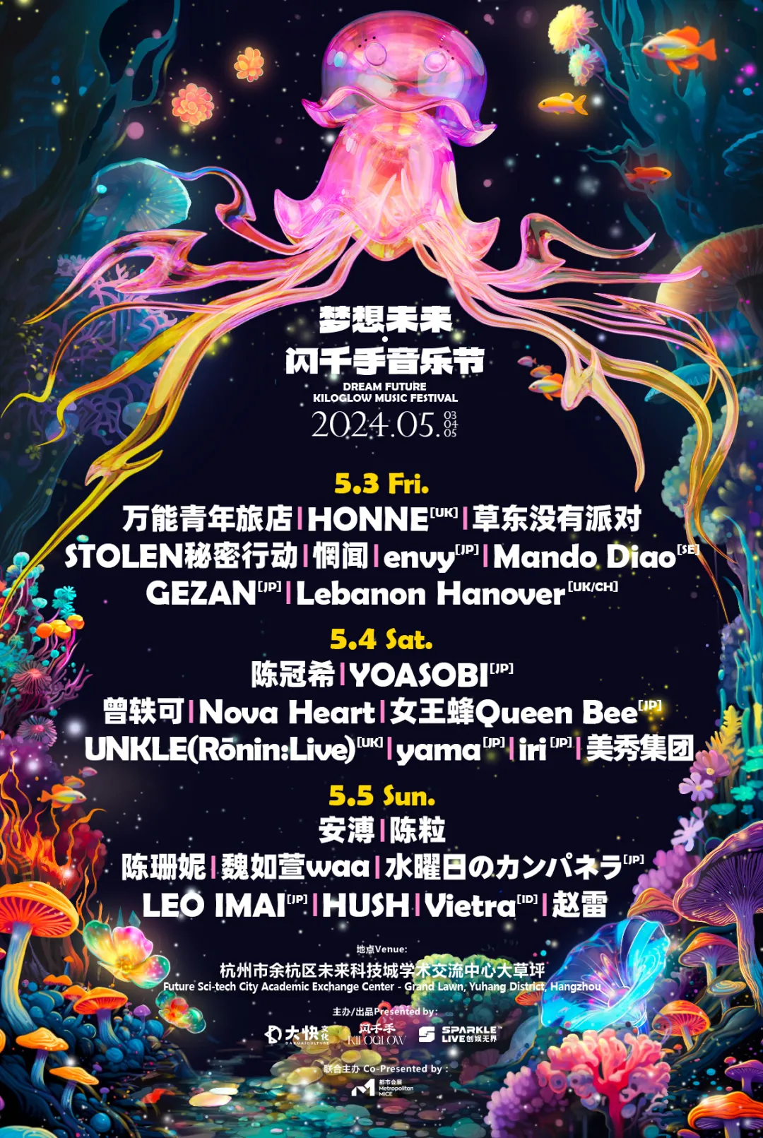 作为promoter,过去半年,闪千手KILOGLOW为泡泡岛音乐节、宇宙岛音乐节、梦想未来音乐节、西湖音乐节、虾米音乐节等预订海外音乐人,也举办了FKJ、King Gnu、ずっと真夜中でいいのに。、HYBS、水曜日のカンパネラ等乐队的中国巡演。