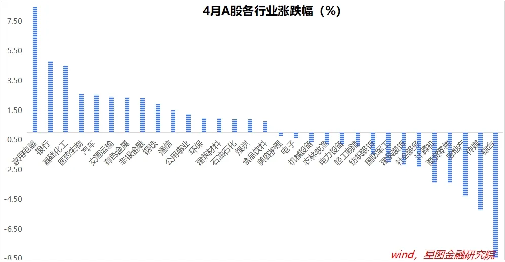 从行业涨幅排名看,4月与前4月涨幅高度重合,均是家电、银行、有色金属领涨,计算机、房地产、商贸零售等跌幅靠前。
