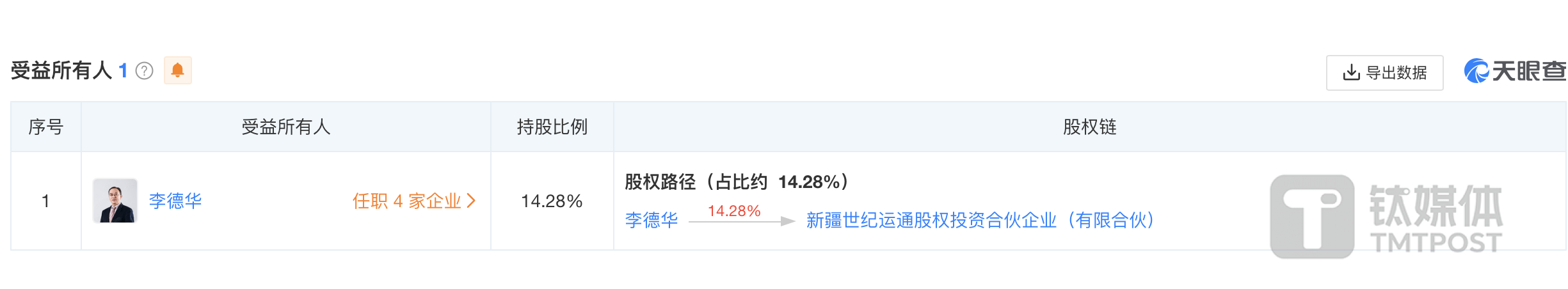 钛媒体APP注意到,李德华亦是劲嘉股份股东。截至2023年12月末,李德华持有公司667.93万股股份,持股比例为0.46%。此外,李德华通过世纪运通间接持有公司的股份。截至2023年年末,世纪运通持有劲嘉股份3945万股股份,持股比例为2.7%,为公司第二大股东,李德华则持有世纪运通14.28%的股权。