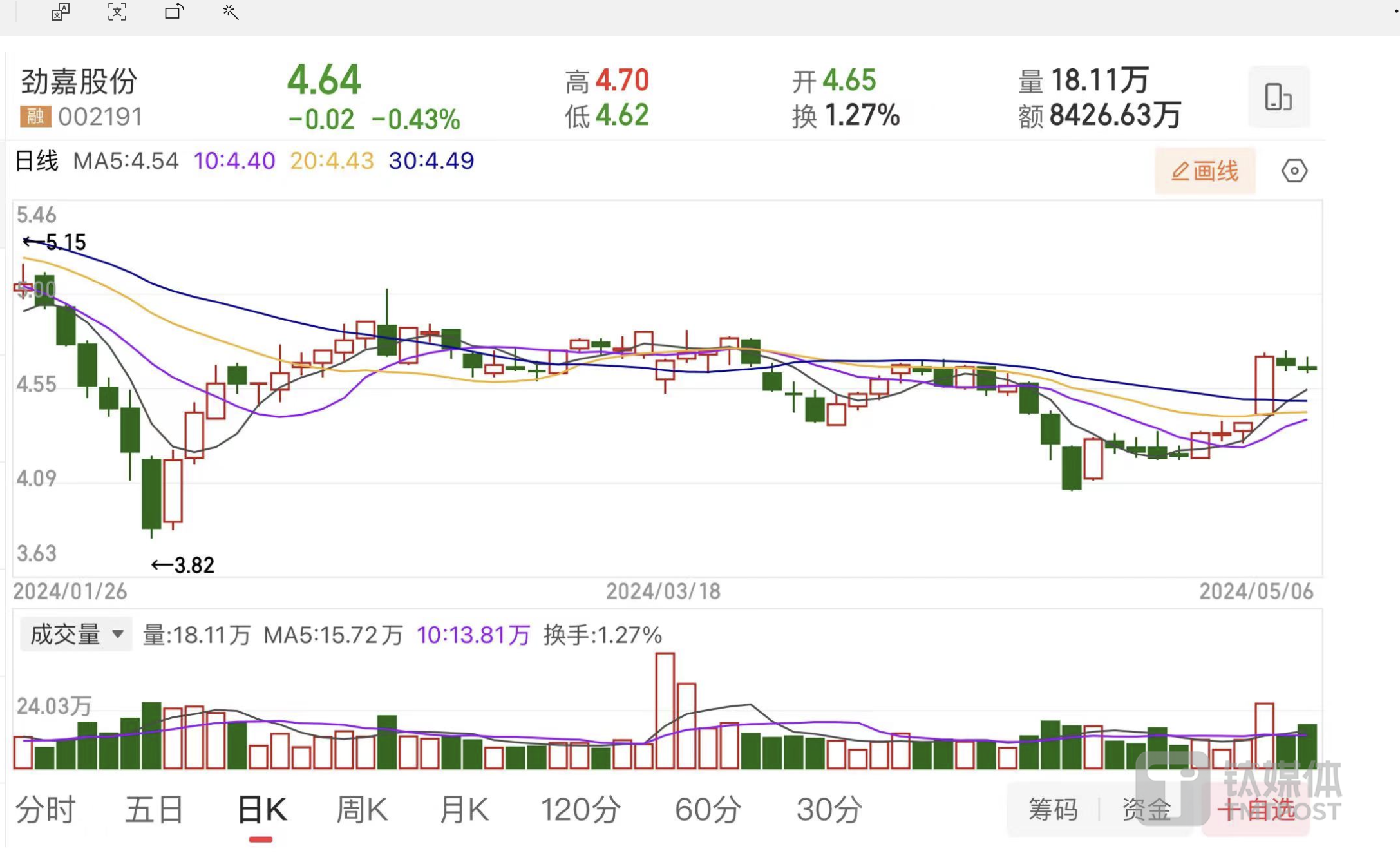 二级市场方面,公司股价于2月5日盘中创下阶段性新低,为3.82元,随后股价有所回升。截至5月6日收盘,公司股价报收4.64元,跌幅0.43%,当前总市值为67.84亿元。