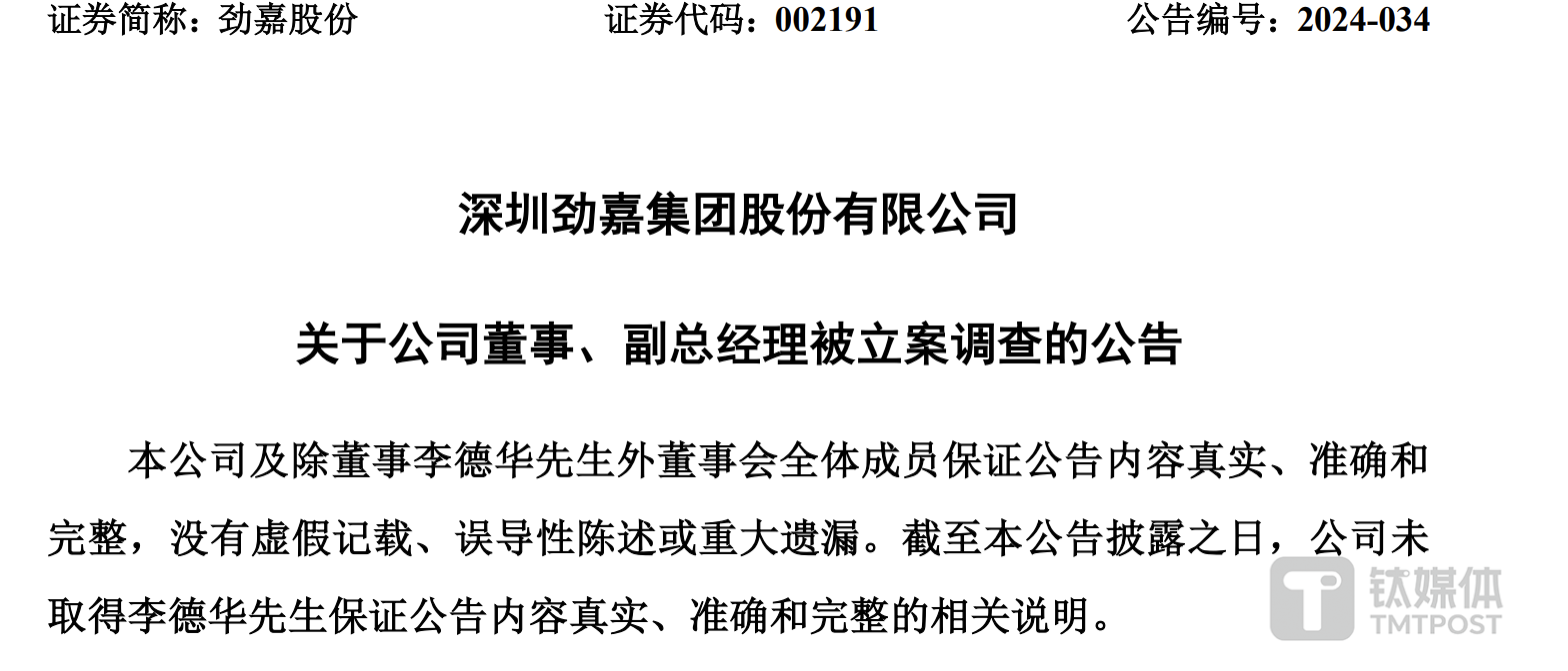 5月5日晚间,劲嘉股份(002191.SZ )发布公告称,公司于2024年5月1日收到大连市金州区监察委员会签发的关于公司董事、副总经理李德华被立案调查并留置的通知书。