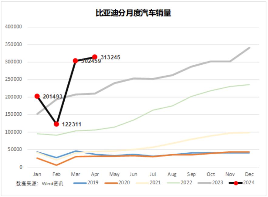4月份比亚迪卖了31.32万辆,同比49%。2020年的时候还是“比三万”,一个月卖3万辆,这才几年,一个月就常态卖30万辆了。