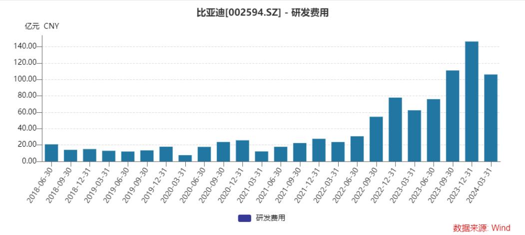 从2023年3季度开始,比亚迪单季度的研发费用就已经迈过100亿大关,2024年1季度106亿,5000多家上市公司中排名第一。