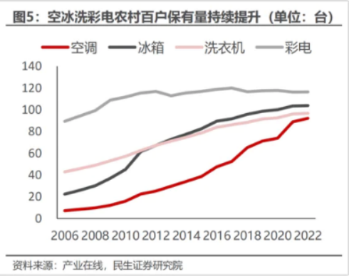 一是,当时农村地区冰箱、洗衣机、空调大家电的保有量低,仍处于普及期。二是,2009年开始房地产刺激,存在大量的新房添置家电和换新需求。房地产拉动之下,国民经济和居民收入的快速提升能将这部分需求快速兑现。而如今这两点强支撑已经基本不具备了。