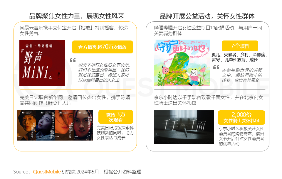 2024年3月8日,是中国首次公开纪念国际妇女节 100 周年,各品牌深入洞察女性群体,从不同方面展示女性风采、为女性公益出力,展现品牌对用户情绪满足、精神关怀的重视。