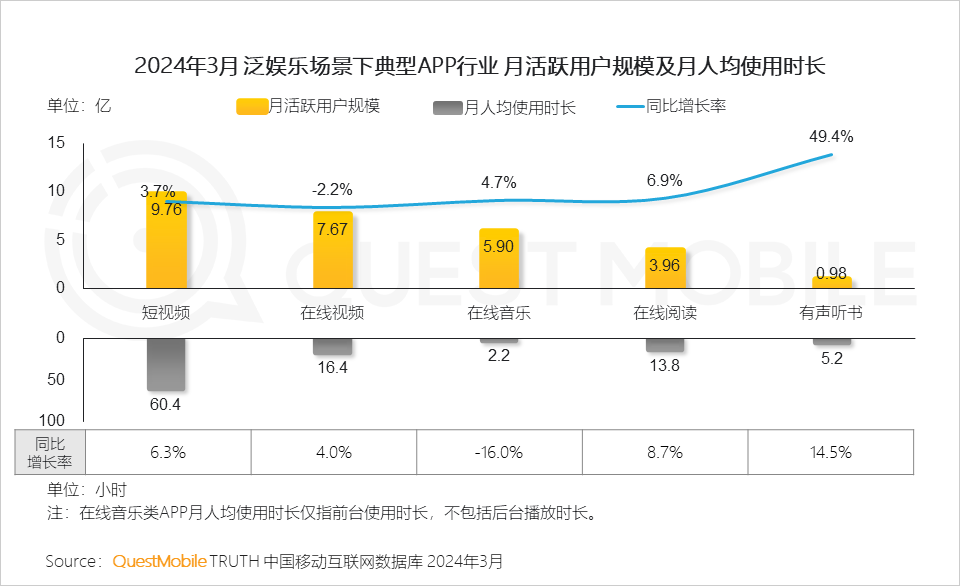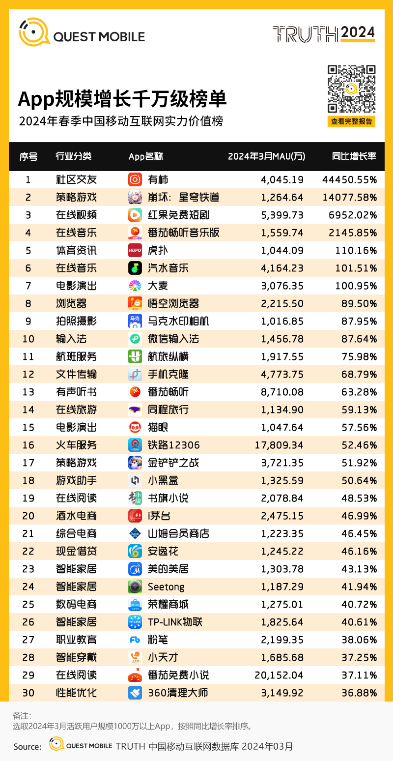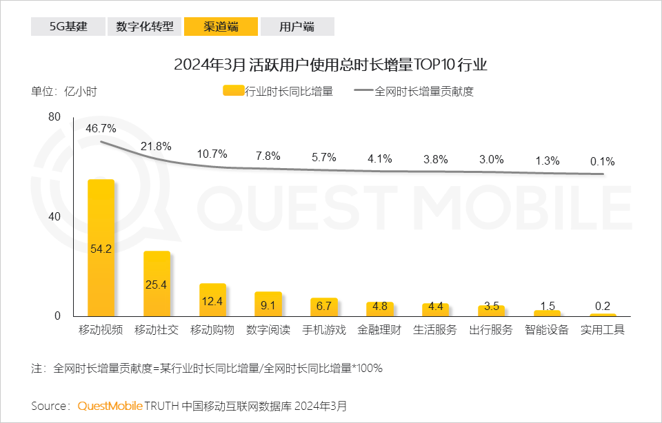 QuestMobile数据显示,2024年3月中国移动互联网活跃用户规模达到12.32亿,同比增量超2,000万。