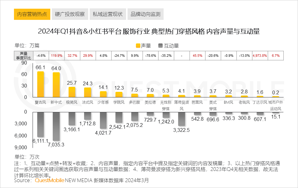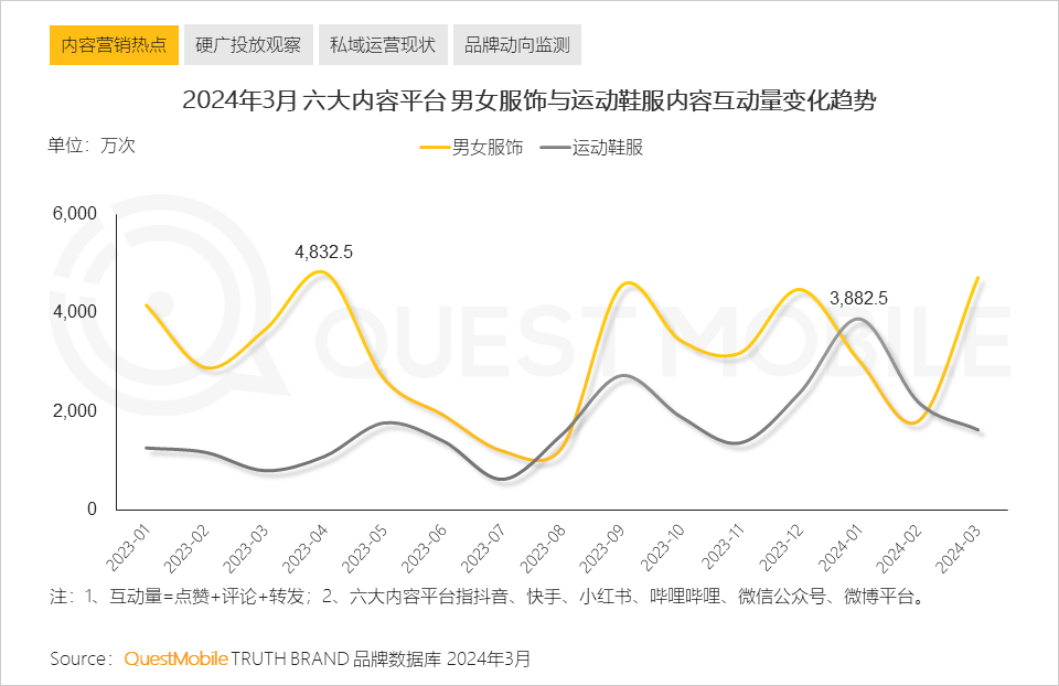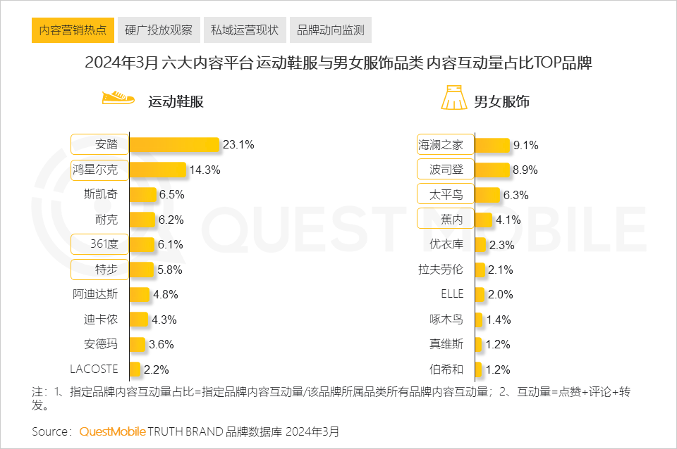 QuestMobile数据显示,2024年3月,安踏、海澜之家分别占据运动鞋服与男女服饰品类下的内容互动量占比之首。