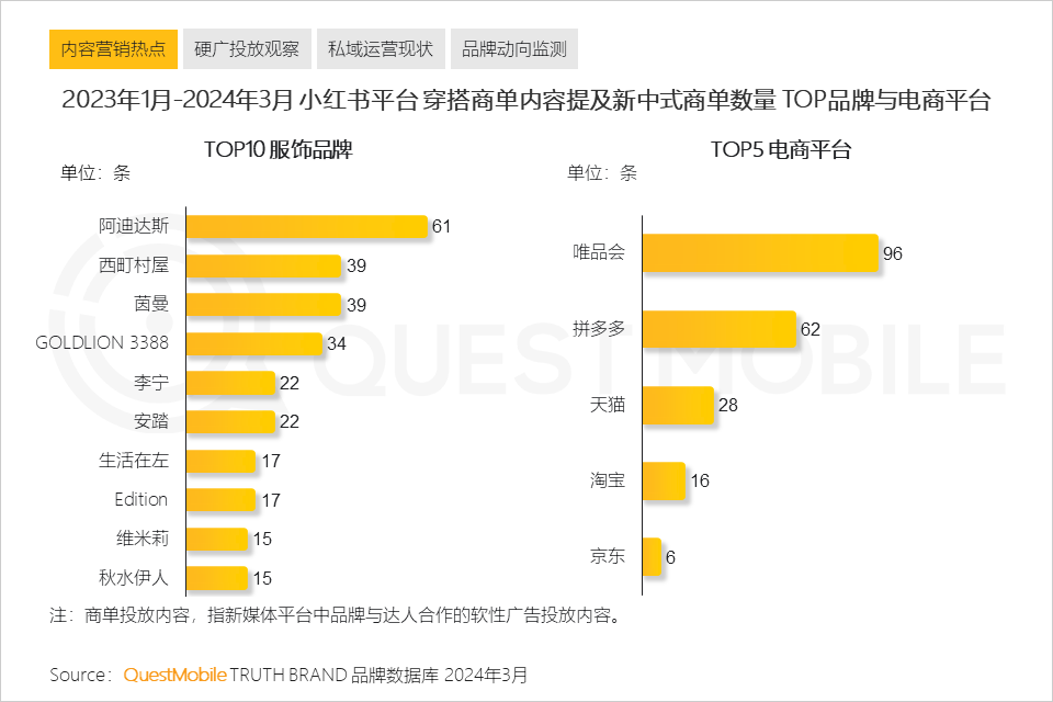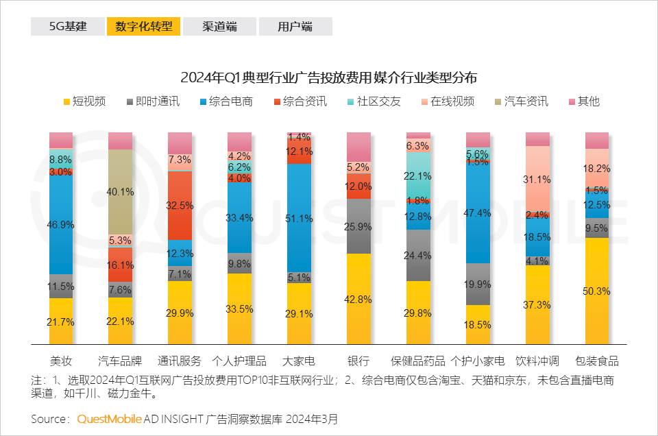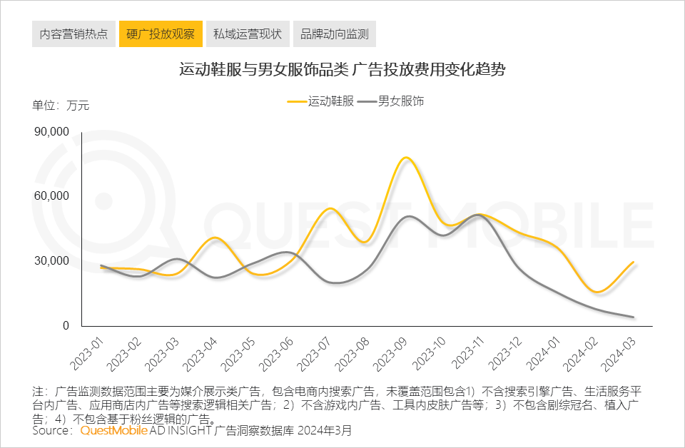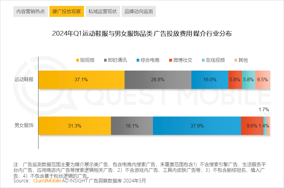 QuestMobile数据显示,2024年Q1相比去年同期,运动鞋服品类投放的效果广告费用占比上升个9.2百分点,男女服饰品类投放的效果广告费用占比上升2.2个百分点。