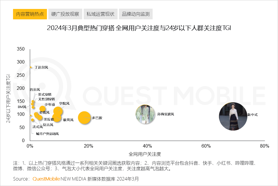 Ⅳ. 新中式与薄荷曼波风穿搭受全网用户关注度最高,此外24岁以下年轻用户的喜好更“小众”,走在时尚前沿,对丁达尔风、芭蕾风、无性别穿搭内容呈现高度偏好
