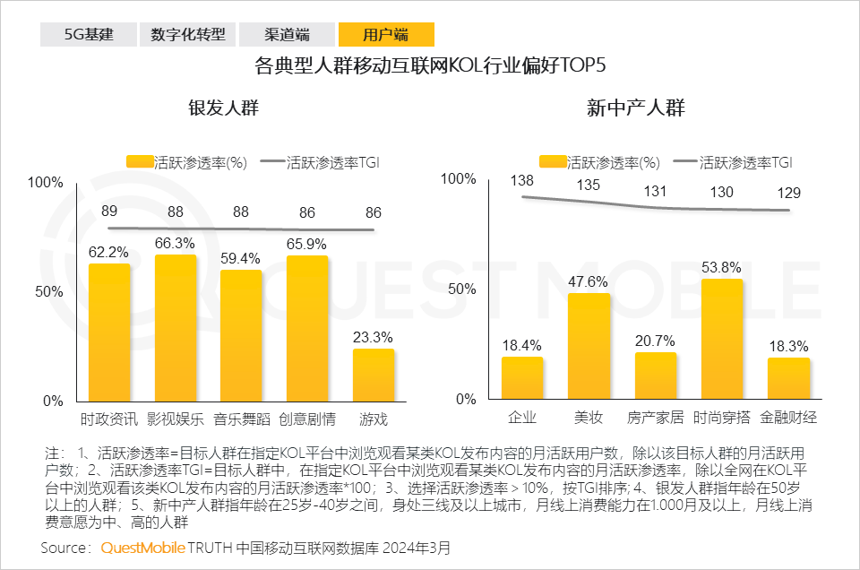 6.7 银发人群偏好时政资讯、影视娱乐类KOL,关注社会热点,追求娱乐休闲,对成熟内容有较高接受度;新中产人群追求职业发展和生活质量提升,借助企业、美妆类KOL获取相关专业知识