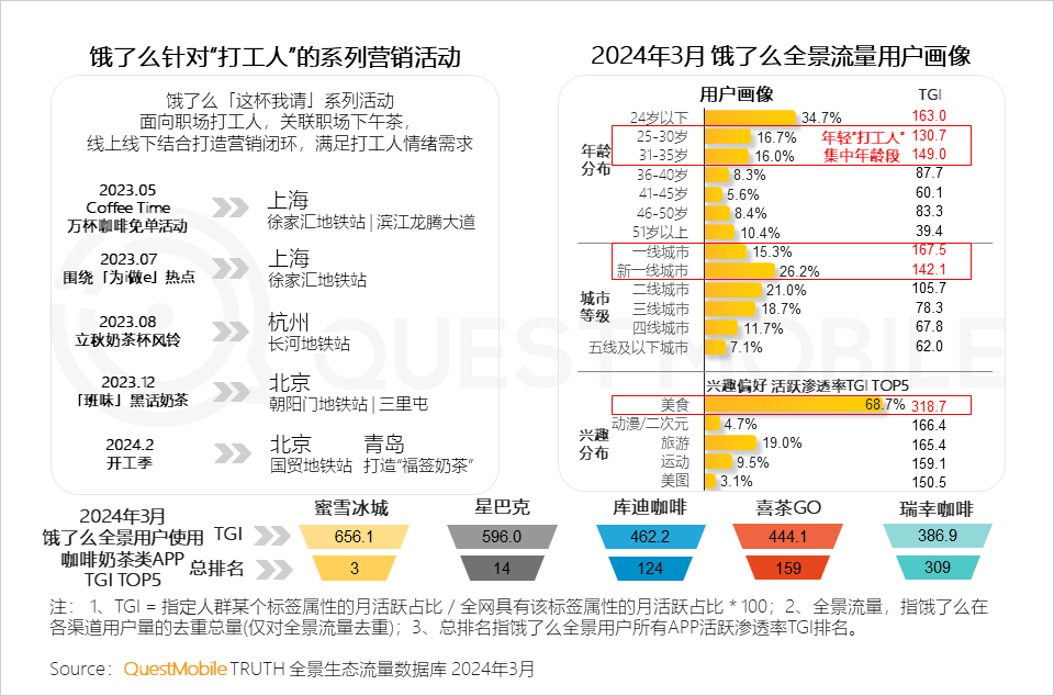 如饿了么针对打工人进行营销“轰炸”,用打工人偏爱的续命奶茶/咖啡“治愈”打工人,营销主题融合打工人流行梗,击中打工人的情绪,从而顺势而为,提升饿了么在其核心群体中的影响力和覆盖度。