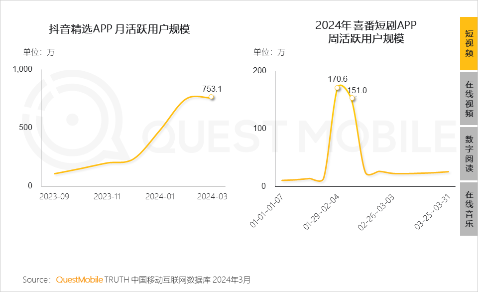 抖音精选APP是抖音旗下中长视频版本,喜番短剧为快手上线的一款独立短剧APP, QuestMobile数据显示,截止2024年3月,抖音精选APP月活跃用户规模达753.1万;喜番短剧APP春节期间流量增长显著,春节周活跃用户规模突破150万。
