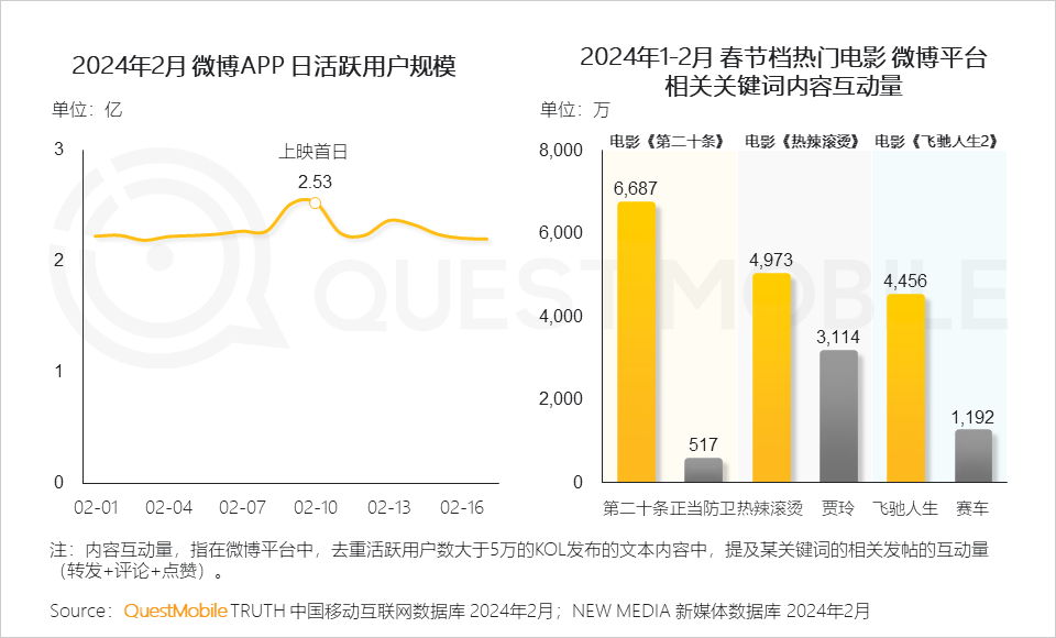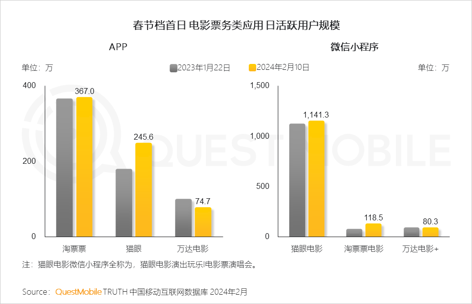 QuestMobile数据显示,猫眼电影抖音小程序2024年2月的月活跃用户规模达381.4万,环比增长725.1%。