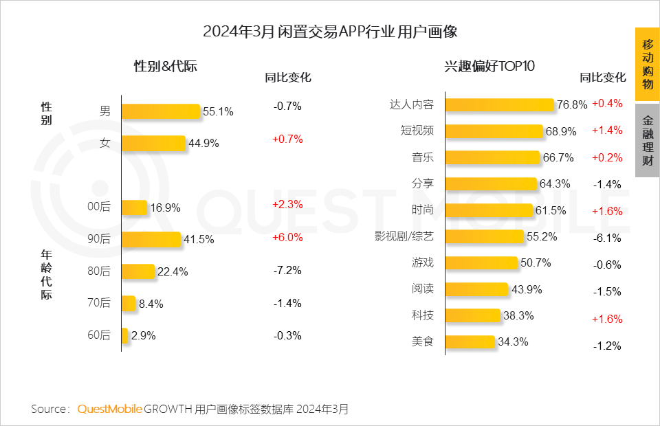 QuestMobile数据显示,闲置交易APP行业用户主要的兴趣偏好为观看达人、短视频及时尚内容,爱听音乐,乐于分享,互联网娱乐、社交属性较强。
