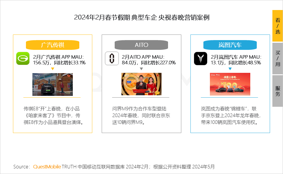 5.5 2月龙年春节,广汽传祺、AITO、岚图汽车等品牌抓住契机与央视春晚密切合作,融入全国家庭欢乐氛围中,触达各圈层人群