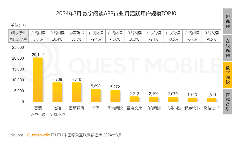 QuestMobile数据显示,2024年3月,番茄免费小说、七猫免费小说及番茄畅听APP活跃用户规模增长显著,同比增长率分别达到37.1%、28.4%和63.3%。