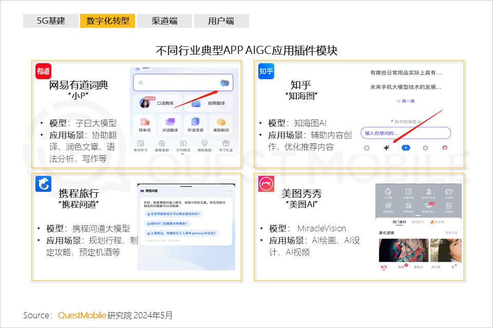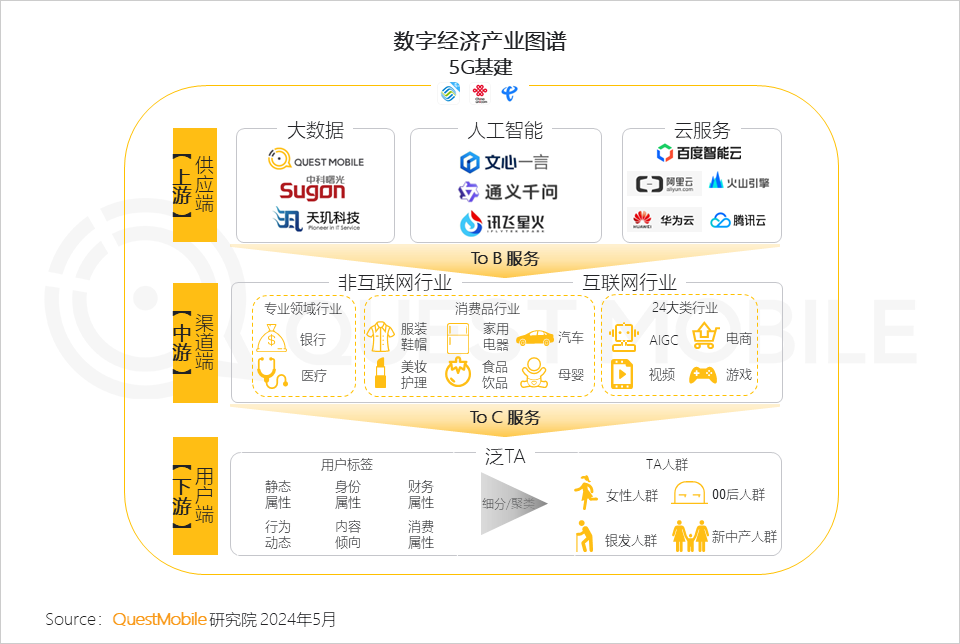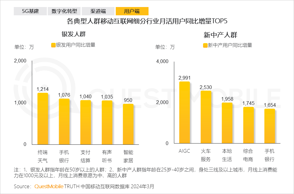 千万别小看这个数据规模,在大数据、AI这条路上,这是无穷的“宝藏”,背后与消费增长、产业发展息息相关,比如:2024年3月中高消费意愿的用户增长明显,占比突破75%,成为移动互联网用户增量的主要构成;同时,女性、00后、银发及新中产群体持续增长,对手机银行、本地生活、有声听书以及AIGC的使用带来了巨大增量……