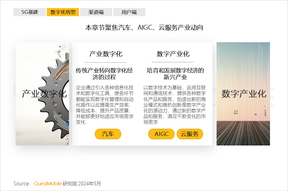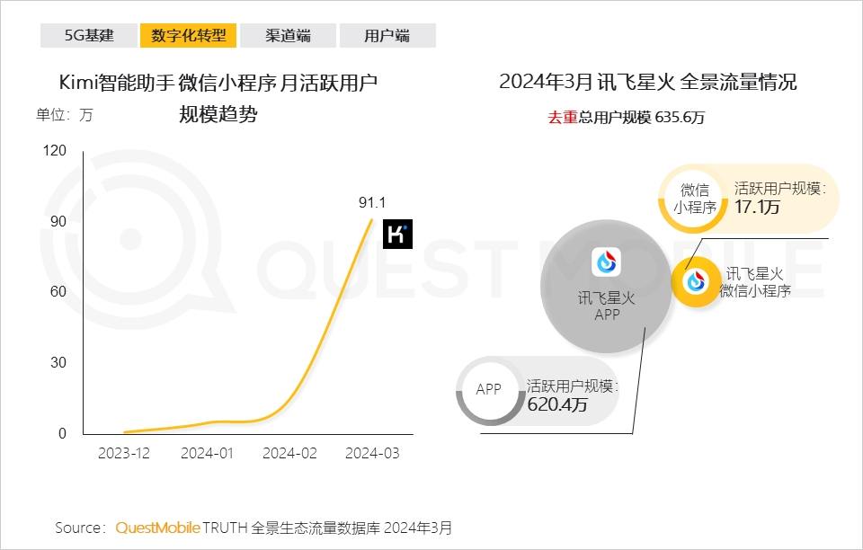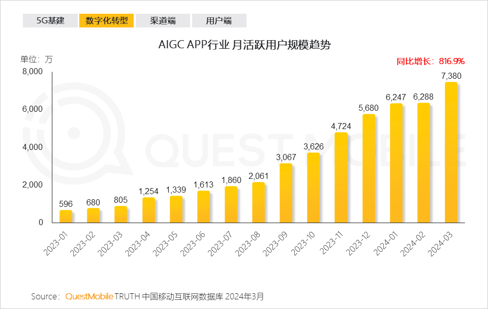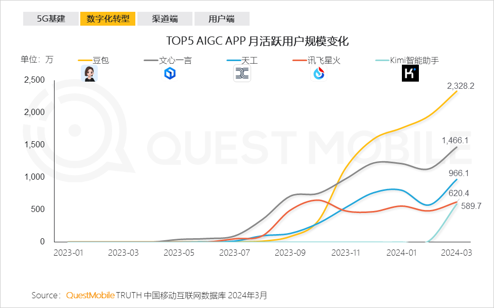 数字产业化的典型代表是AIGC,截止到2024年3月,AIGC APP行业用户已经突破7380万,同比增长了8倍,其中,抖音旗下的豆包、百度旗下的文心一言以及天工、讯飞星火、Kimi智能助手月活跃用户分别为2328.2万、1466.1万、966.1万、620.4万、589.7万 。