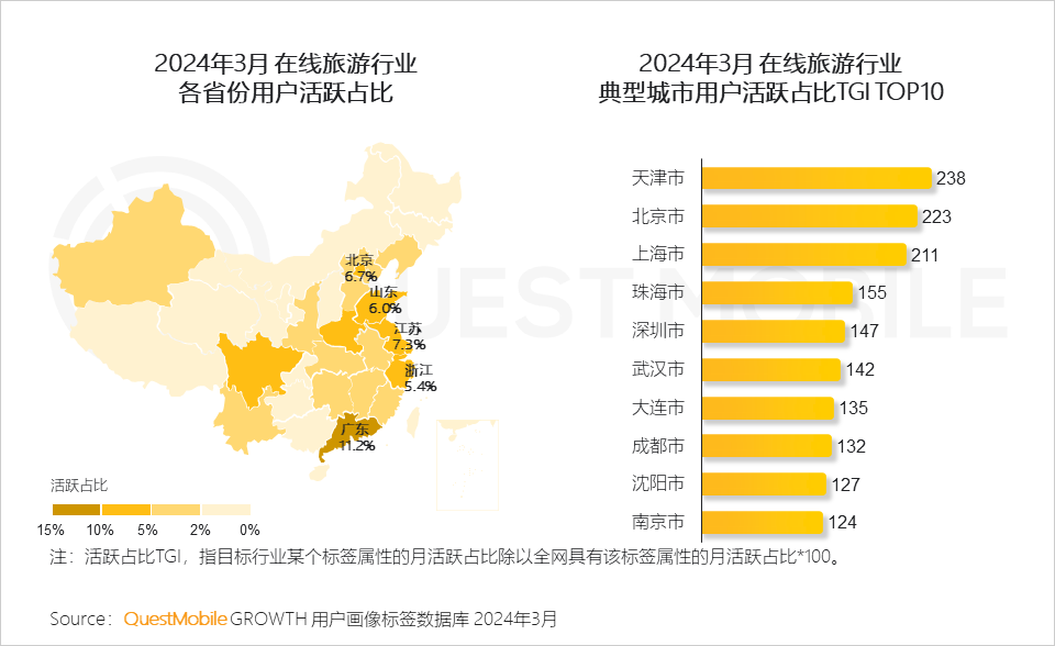 3.3 在线旅游行业流量地域分布以沿海省份居多,河南、四川在内地较为突出,西部地区新疆流量占比显著