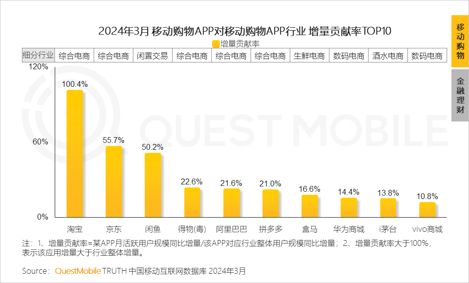 QuestMobile数据显示,淘宝、京东、闲鱼APP为移动购物行业流量的增长贡献较高,超50%。