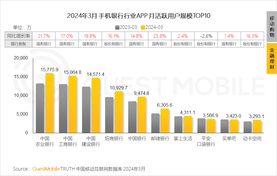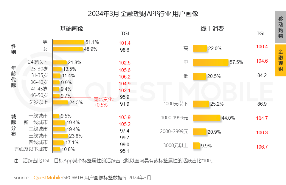 QuestMobile数据显示,51岁以上银发群体搭上数字金融快车,3月活跃占比24.3%,同比增长0.5%。