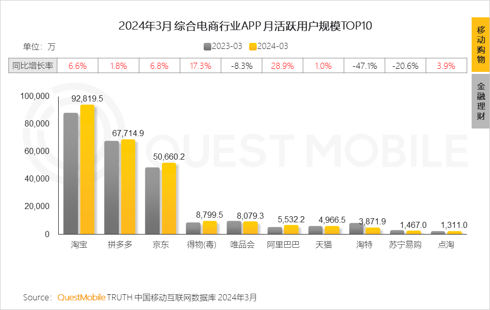 QuestMobile数据显示,3月移动购物APP行业月活跃用户规模同比增长5.7%,达10.73亿。