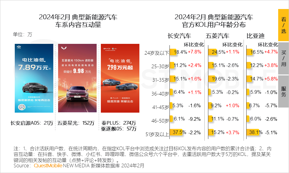 QuestMobile数据显示,典型新能源车企扩大广告“攻势”并深耕泛内容平台,2月正式打响“价格战”后,长安汽车、比亚迪官方KOL 35岁以下用户增长,相比之下五菱汽车KOL 吸引更多24岁以下、41岁以上用户。