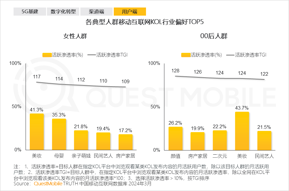6.6 女性人群倾向于关注美妆和母婴领域的KOL以获取相关建议和信息; 00后人群通过颜值类KOL了解时尚审美等信息,借助房产家居类KOL获取相关信息