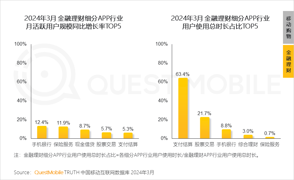 4.10 细分行业方面,手机银行、保险服务等行业活跃用户规模同比增长较快,超10%;支付结算行业用户使用时长占比最高,达63.4%