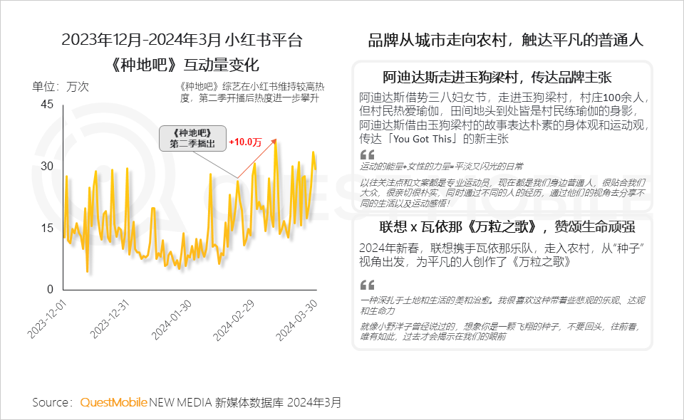 7.5 从城市营销走向农村营销;人们对田野生活和乡土的向往,推动《种地吧》综艺的火热,品牌也发现了新的营销土壤,走进农村,围绕普通人、朴素生活展开,引发用户共鸣