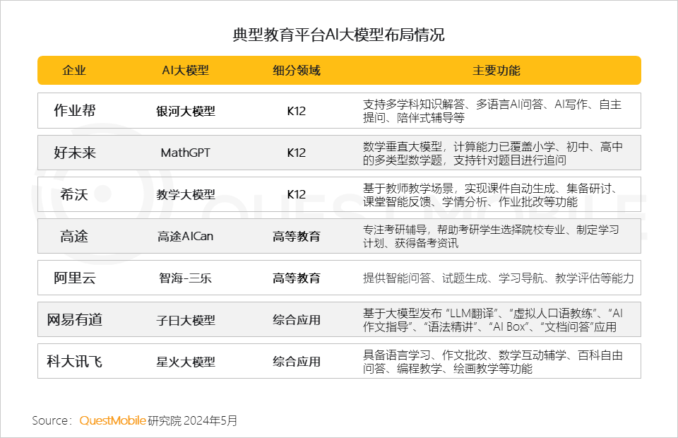 Ⅲ. AI大模型落地在线教育,各企业的自研教育大模型陆续发布,并逐步落地应用,为用户提供个性化分析与指导、引导陪伴式学习、知识整合