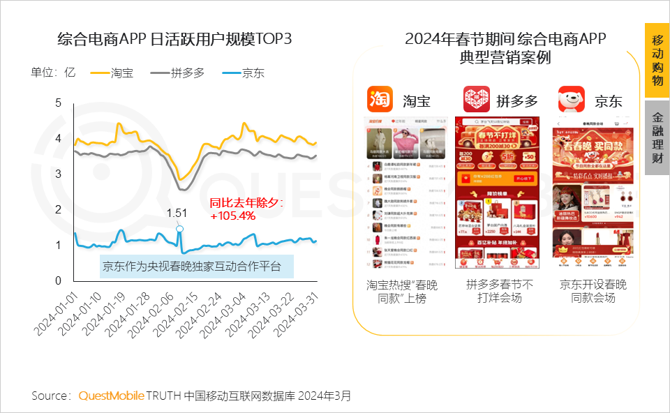 QuestMobile数据显示,京东作为央视春晚独家互动合作平台,除夕当天流量达1.51亿,同比去年除夕流量增长105.4%。