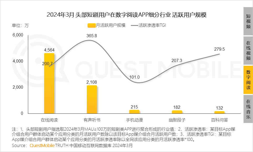 1.6 短剧用户对于数字阅读表现出较强偏好,头部短剧用户在在线阅读、有声听书行业活跃规模均超2,000万,活跃渗透率TGI分别高达200.7、365.8