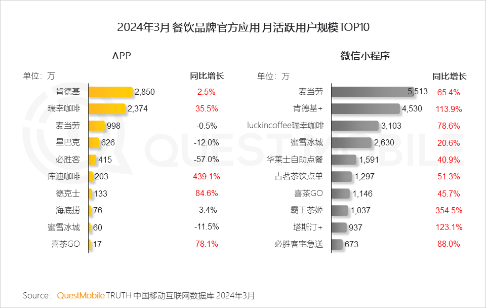 Ⅵ. 餐饮品牌以微信小程序作为主要的线上点单渠道,TOP10品牌流量均保持快速增长;APP端则承担更多功能,品牌通过会员积分活动留存私域用户