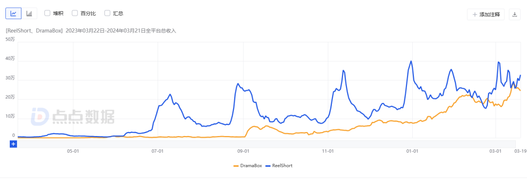 ReelShort和DramaBox最近一年的全球营收曲线对比 | 图片来源:点点数据