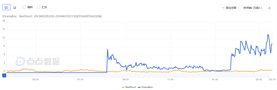 DramaBox和ReelShort近一年的ARPDAU曲线|图源:点点数据