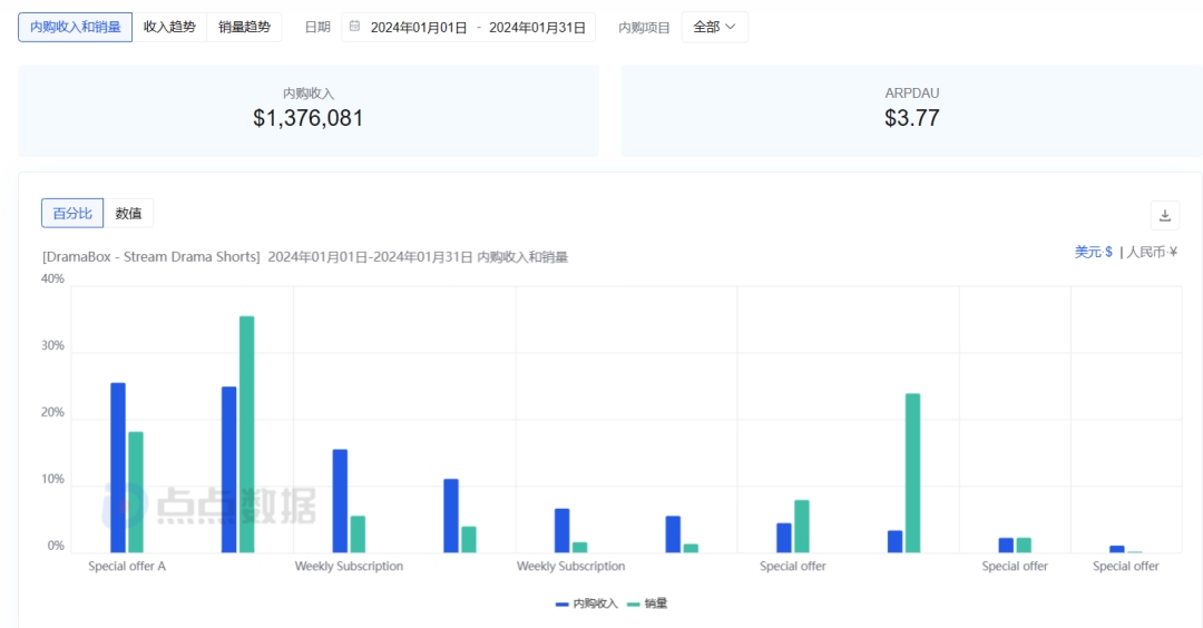 DramaBox内购项目收入和销量情况 | 图源:点点数据