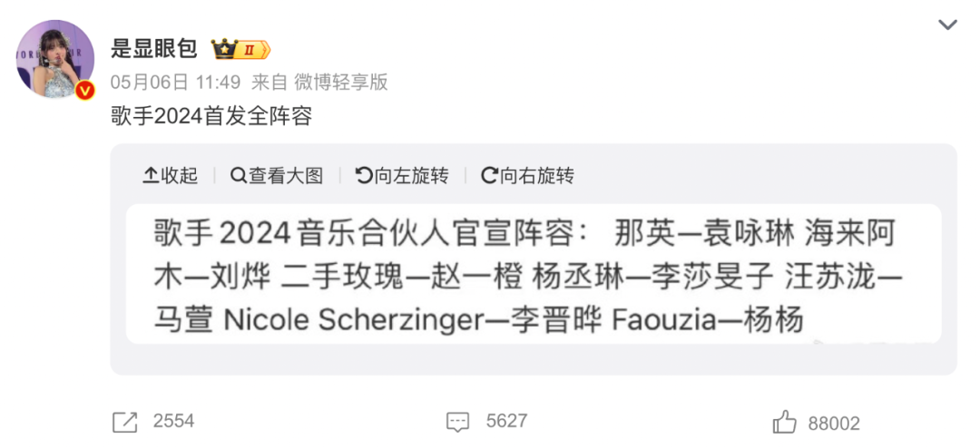 虽然这份网传阵容尚未得到官方确认,但从名单上的歌手纷纷抵达长沙的行程来看,基本上应该是板上钉钉。《歌手2024》首发阵容之所以引来网友一片争议,不止是因为网传的火星哥(Bruno Mars)、朴彩英、陶喆等重磅音乐人均不见踪影,也因为出场名单不仅惊喜欠奉,更有一种类似“拼盘音乐节”的违和感。