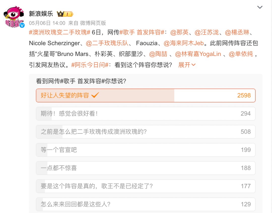 5月10日,经历四年“沉淀”的《歌手2024》即将正式回归,从几个月来的预热造势来看,颇有一种“王者归来”的势头。然而,当昨天首发阵容曝光之后,微博、豆瓣等平台却是一片失望之声,更有网友吐槽“这样的阵容,还不如不重启”,“歌手 首发阵容”也因此登上了微博热搜。